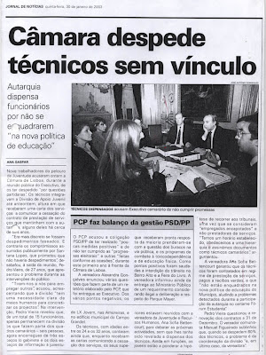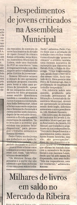 em janeiro de 2003 fui convidado a sair pela mão de santana e sus muchachos, na companhia de mais "trabalhadores independentes" que ocupavam espaço vital precioso, afinal era necessário abrir alas à rapaziada que ciclicamente saltita atrás dos líderes nas noites eleitorais, eu cá tenho pouco jeito para os pulinhos, entre outras cabriolas físicas, e lá fui à vidinha, mantendo sempre algum interesse pelas movimentações deste lúmpen político que vai não volta tenta respirar acima da linha de água. ei-los de volta, às candidaturas, sob a capa do lisboa com sentido. sei bem qual é esse sentido, é único, e na direcção do abismo ou do lugarinho à sombra da bananeira. este meu post, estes recortes de imprensa, que fazem parte da minha vida pessoal e profissional, são o meu contributo para a refrega, a minha oferta aos lisboetas. há palhaçadas que mais vale não repetir, as tortas na cara só costumam ter graça à primeira. ou nem isso.